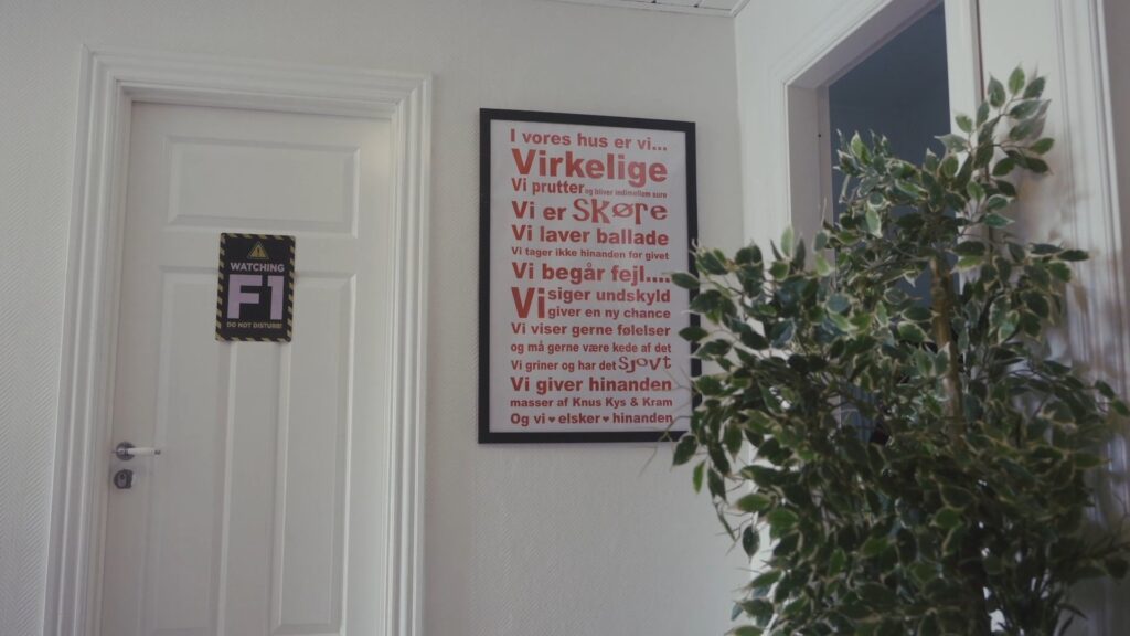 Huset består af en stueetage og en kælder, hvor vi i vores indretning har haft fokus på at skabe en hjemlig og god atmosfære. Vores borgere har selvfølgelig hver sit værelse, hvor de kan indrette sig, så værelset afspejler dem og deres stil, og således kan blive deres egne trygge base. Derudover er der to badeværelser, som vores 6 beboere deles om. Der er også et soveværelse og et badeværelse til vores personale, der overnatter i huset. Vi har også flere fællesområder som vores køkken og spisestue, hvor vores beboere og personale i fællesskab laver mad og spiser, ligesom en familie.